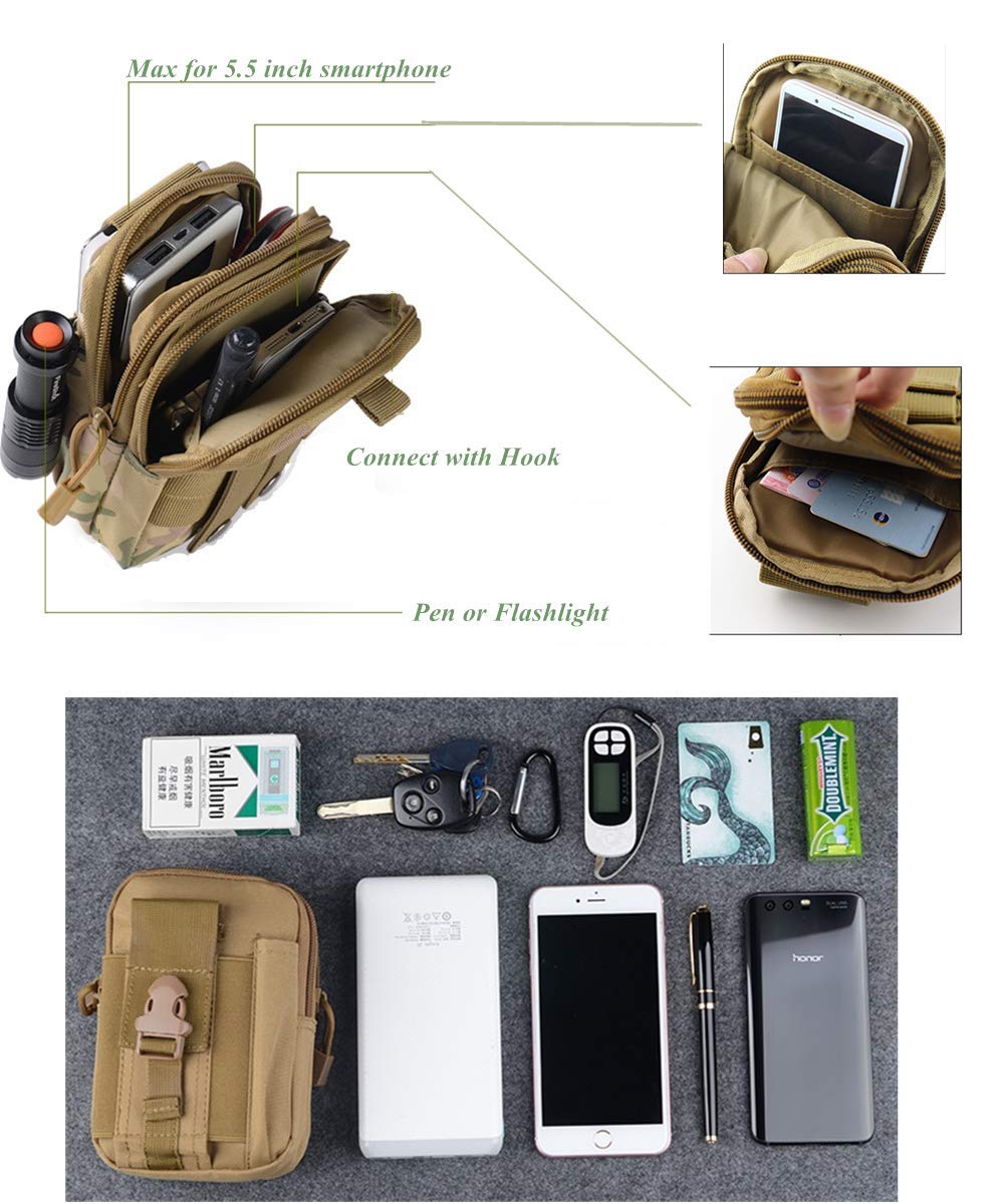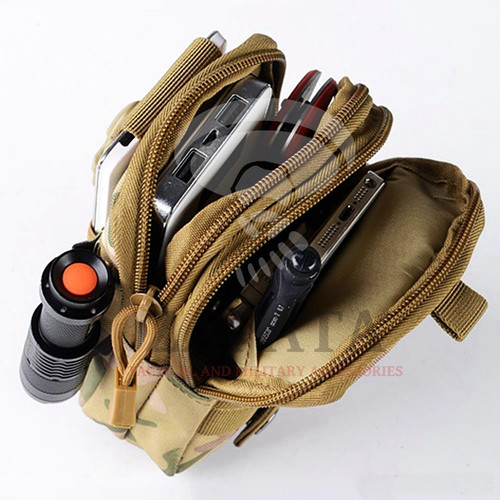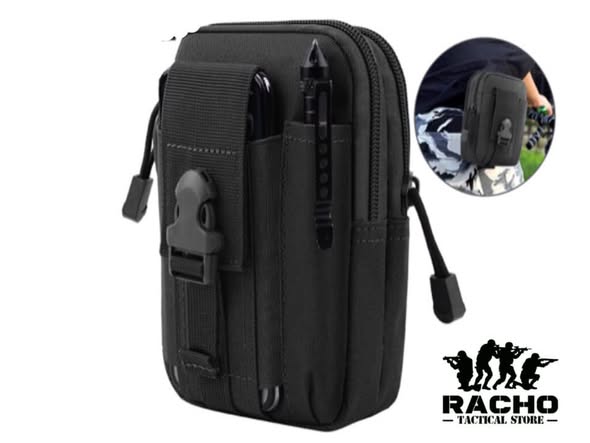 Pouchs tactico con bolsillo para teléfono móvil con múltiples compartimientos  con banda elástica y hebilla para proteger los móviles de caídas. 1 funda para bolígrafo para un acceso rápido. 2 compartimentos con cremallera (ambos con una capa de nailon) para pequeños dispositivos