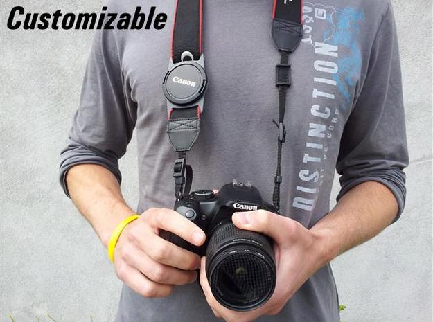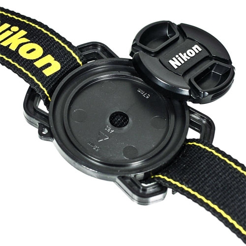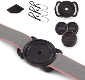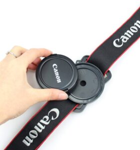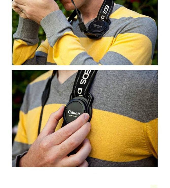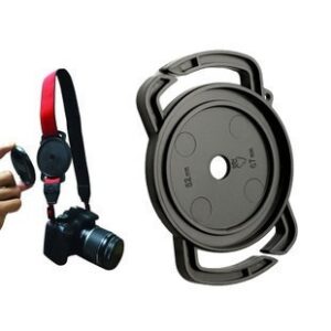 El soporte para tapa de lente de cámara con hebilla fija de forma segura la tapa de la lente de su cámara a la correa para el cuello o a la bolsa de la cámara.